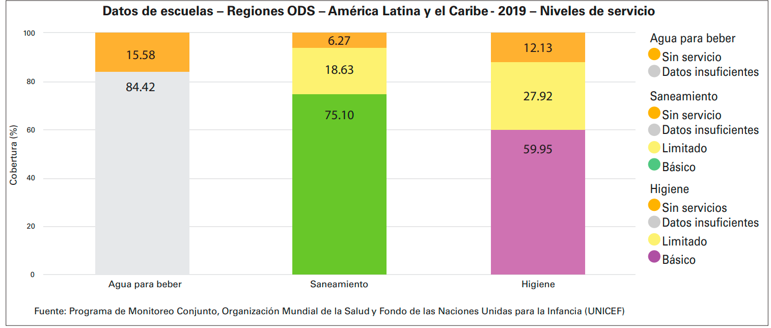 Las escuelas rurales, por su parte, son un actor esencial para el desarrollo de niños y niñas, a pesar de lo cual, en América Latina y el Caribe aún un 15% de ellas carece de servicios de agua, un 25% no dispone de servicios de saneamiento o éste es muy limitado, y casi el 40% no disfruta de servicios de higiene, según los datos publicados en 2021 por el programa de Monitoreo Conjunto para la Provisión de Agua, Saneamiento e Higiene (JMP por sus siglas en inglés).