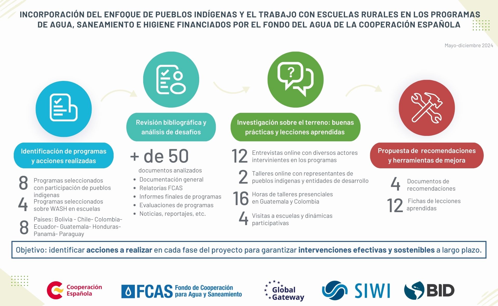 El Fondo de Cooperación para Agua y Saneamiento está llevando a cabo, a través de SIWI y el BID, un estudio para analizar en profundidad dos aspectos clave para su estrategia global: ¿cómo se está trabajando en las escuelas? y ¿de qué manera se está implementando el enfoque de diversidad cultural para incorporar a los pueblos indígenas en los programas de agua y saneamiento?