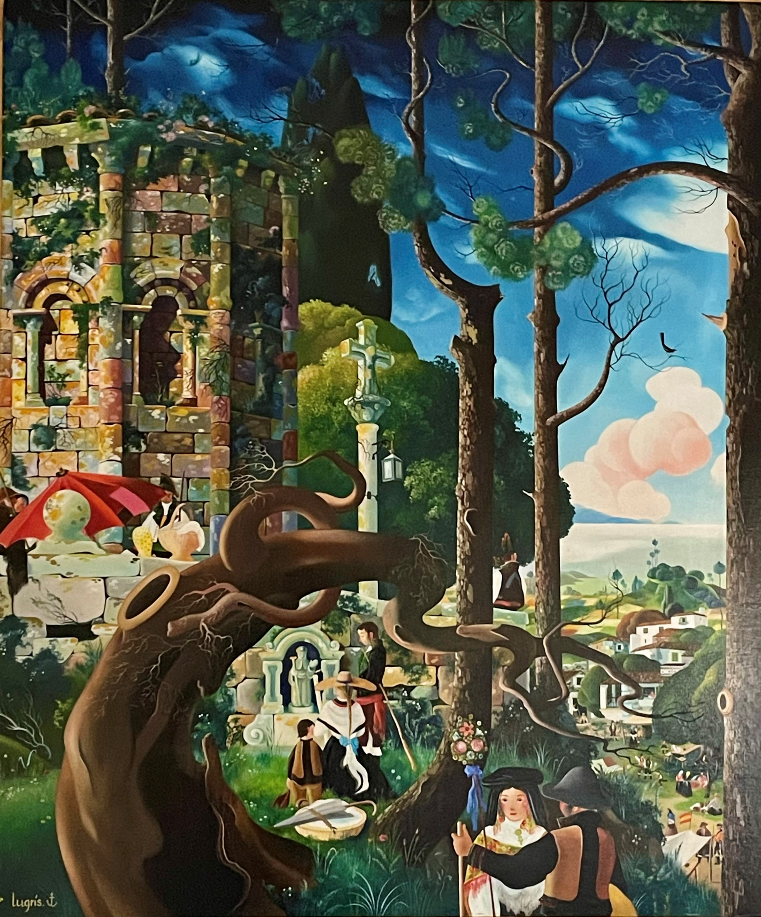 Dicen que Lugrís comenzaba sus cuadros pintando el cielo y lo hace con un azul tan intenso que casi parece irreal y que recuerda a los del pintor flamenco Joachim Patinir (1480-1524). El artista señalaba: “Pinto en gallego, razón por la cual no puedo ser realista”. Sus pinturas, aparentemente sencillas, están cargadas de misterio y referencias sutiles. Este cuadro, "Romería Gallega 1830", pintado al óleo  a principios de  la década de los cincuenta del siglo XX, está lleno de detalles. Además del mar, uno de los temas preferidos de Urbano Lugrís fue la romería. Tanto "Romería Gallega 1830" como "Retablo del Descubrimiento", compuesto por trece tablas, son obras del pintor gallego, patrimonio de la colección artística de la AECID. Lugrís fue uno de los pintores más importantes del panorama artístico gallego del siglo XX  y, si Maruja Mallo es la artista más relevante del surrealismo, Lugrís lo fue como pintor ligado a esta estética. M.B.